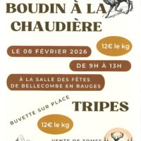 L’association communale de chasse agréée (ACCA) de Bellecombe a le plaisir de vous annoncer leur vente à emporter de Boudin à la chaudière et de Tripes. Rendez-vous le dimanche 8 février de 9 h à 13 h à la salle des fêtes de Bellecombe en Bauges. Sur place, buvette, vente de Tome et bien sûr […]