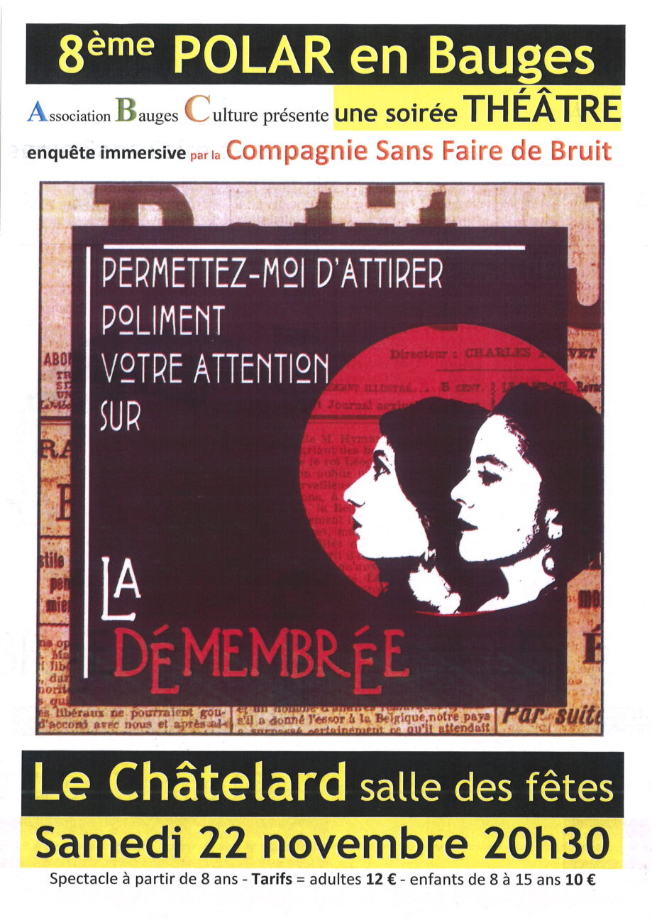 * 20h30 : Théâtre « La Démembrée » par la Compagnie Sans faire de bruit (dès 8 ans).