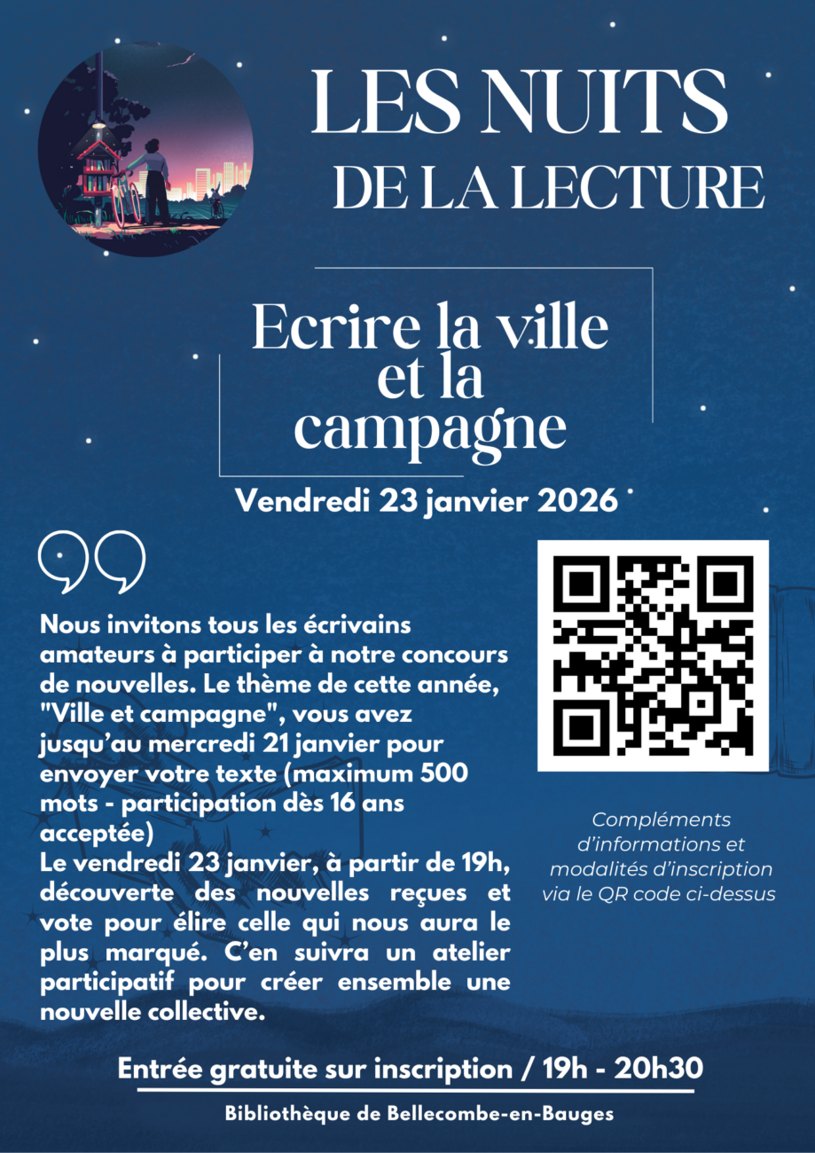 Pour les adultes, un atelier d’écriture est proposé. Vous êtes invité(e)s à soumettre une nouvelle (maximum 500 mots) en lien avec la thématique « Ville et campagne ». Envoyez votre texte avant le mercredi 21 janvier via notre adresse mail : bibliotheque@bellecombeenbauges.com. Le vendredi 23 janvier à partir de 19h, nous lirons les nouvelles et élirons celle qui nous aura le plus touchés. Mais ce n’est pas tout : un moment collaboratif sera également proposé pour tenter d’écrire ensemble une nouvelle collective.