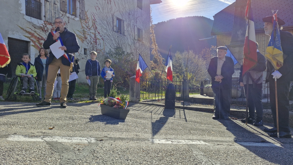 Monsieur le Maire a ouvert la cérémonie en présentant le drapeau du civisme à destination de l’école primaire de Bellecombe en Bauges réalisé par l’association « Le Souvenir Français » afin d’ancrer les enjeux mémoriaux au cœur de la scolarité des élèves et de les sensibiliser.